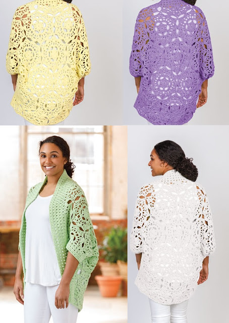 Charming Vesna motifs and distinctive shaping make the Sunday Morning Crochet Cardi easy to wear yet sophisticated. Throw it on over any outfit for just the right touch. To make finishing quicker, the motifs are joined as you go along. The pattern includes directions for sizes S/M (L/XL, 2XL/3XL) with a finished width (not including sleeves) of 40 (42.5, 45) inches.